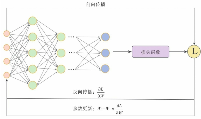 神经网络的运行过程分为三步: 前向传播、 反向传播、 参数更新, 通过不断迭代进行 模型参数的更新, 以从数据中挖掘出有价值的信息, 如图所示。