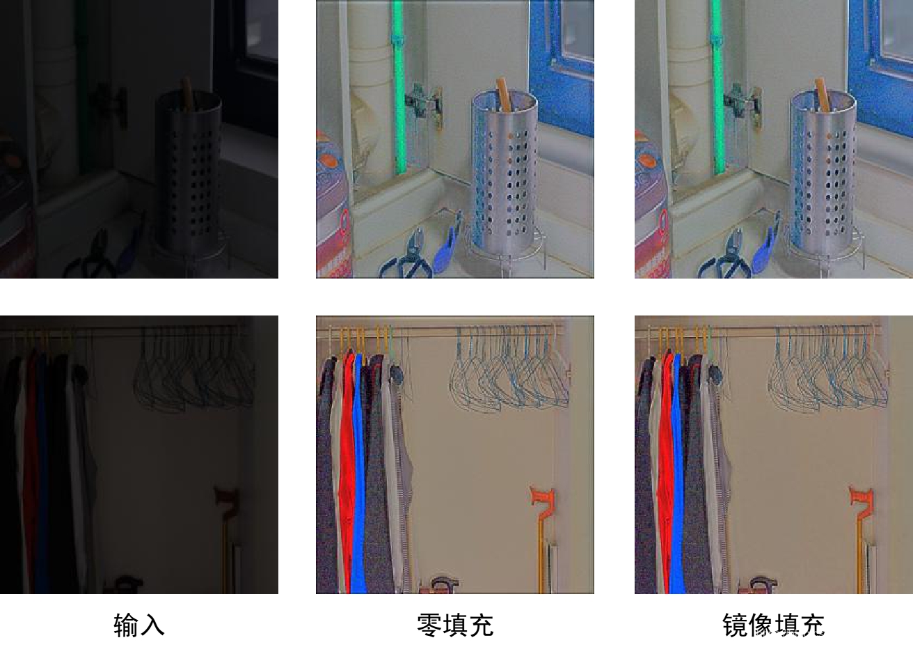 以低光照增强任务为例,最终对比效果如下图。零填充会产生边缘伪影,而镜像填充很好地缓解了这一效应。