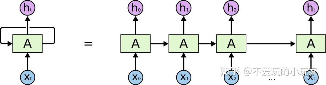 其中,$X_t$为输入,$A$为模型处理部分,$h_t$为输出。为了更容易地说明递归神经网络,把上图展开,得到: