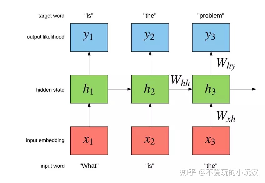 这样的一条链状神经网络代表了一个递归神经网络,可以认为它是对相同神经网络的多重复制,每一时刻的神经网络会传递信息给下一时刻。如何理解它呢?假设有这样一个语言模型,我们要根据句子中已出现的词预测当前词是什么,递归神经网络的工作原理如下: