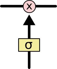 这两个图可以对应起来看,下图中心的$c_t$即cell,从下方输入($h_{t−1}$,$x_t$)到输出$h_t$的一条线即为$cell\ $$state$,$f_t$,$i_t$,$o_t$分别为遗忘门、输入门、输出门,用sigmoid层表示。上图中的两个$\tanh$层则分别对应cell的输入与输出。LSTM可以通过门控单元可以对cell添加和删除信息。通过门可以有选择地决定信息是否通过,它有一个sigmoid神经网络层和一个成对乘法操作组成,如下: